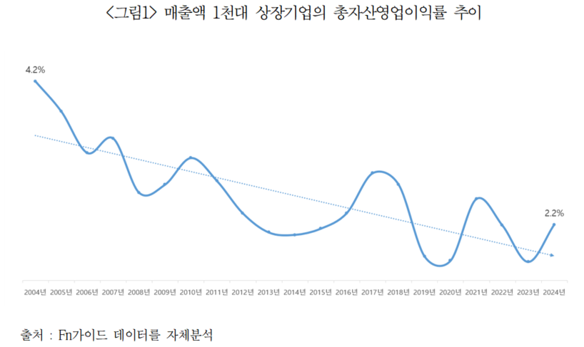 대한상공회의소(회장 최태원)는 10일 ‘K성장 시리즈(6) 매출액 1천대 기업의 20년 수익성 추이와 시사점’ 보고서를 통해 2004년만 해도 자산 1억원으로 4백2십만원의 수익을 남겼는데, 지금(2024년)은 2백2십만원만에 그친다고 밝혔다. 총자산영업이익률이 4.2%에서 2.2%로 크게 떨어졌다는 것이다. 총자산영업이익률은 영업이익을 총자산으로 나눈 지표로, 기업이 자산을 얼마나 효율적으로 활용해 수익을 냈는지를 단적으로 보여준다.