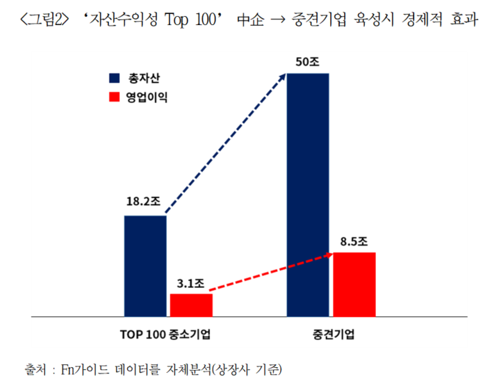 대한상의는 중소기업 상장사 중 ‘총자산영업이익률’ 상위 100개 기업이 중견기업으로 성장한다면, 단순 계산해 봐도 5.4조원의 부가가치를 추가 창출할 것으로 예상했다. 2024년 이들 기업의 평균 총자산영업이익률은 17.1%로 자산합계 18.2조원을 활용해 3.1조원의 이익을 창출하고 있지만, 정책지원을 통해 중견기업(자산규모 5천억원)으로 성장한다면, 50조원(5천억원×100개) 규모의 자산으로 8.5조원의 수익(50조원×17.1%)을 벌어들일 수 있다는 계산이다.