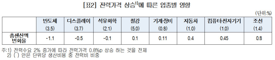 대한상의 SGI 박경원 연구위원은 “전력가격 상승이 산업별 생산활동에 미치는 영향은 업종별 투입구조 차이로 인해 다르다”며 “제조원가에서 전력비의 비중이 높고 다른 에너지원으로의 대체가 어려운 반도체‧디스플레이 등 전력집약산업은 생산비 부담이 급격히 커져 생산 위축으로 이어질 가능성이 있다”고 설명했다.