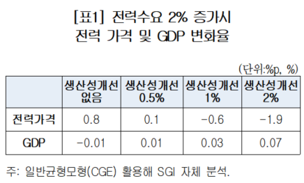 공급 변화 없이 전력수요가 늘어났을 때 전력가격이 상승하고 GDP가 감소했으나, 전력산업의 생산성이 1% 개선될 경우 전력가격은 일반 물가 대비 0.6%p 하락하고 GDP는 0.03% 증가하는 것으로 나타났다. 업종별로는 전력가격 상승으로 타격을 입었던 반도체(산출량 △1.1%)와 디스플레이(△0.5%) 부문의 산출 감소폭이 크게 줄었다(반도체 △0.8%, 디스플레이 △0.3%)