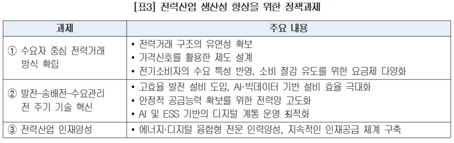SGI는 전력산업의 생산성 향상을 위한 정책 과제로 △ 수요자 중심 전력거래 방식 확립, △전력산업 전주기 기술혁신, △에너지·디지털 융합형 전문 인력양성 등을 제시했다.