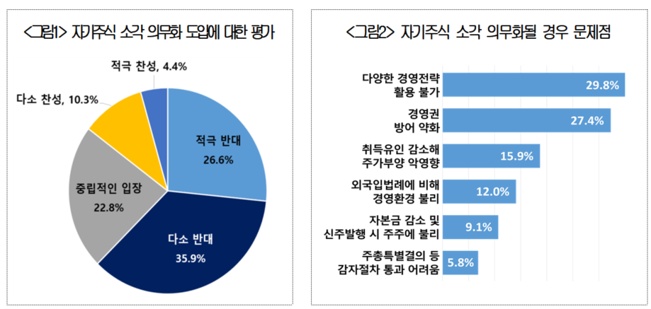 소각 의무화의 문제점으로는 ‘사업재편 등 다양한 경영전략에 따른 자기주식 활용 불가’(29.8%), ‘경영권 방어 약화’(27.4%), ‘자기주식 취득 요인 감소해 주가부양 악영향’(15.9%), ‘외국 입법례에 비해 경영환경 불리’(12.0%) 등을 들었다.
