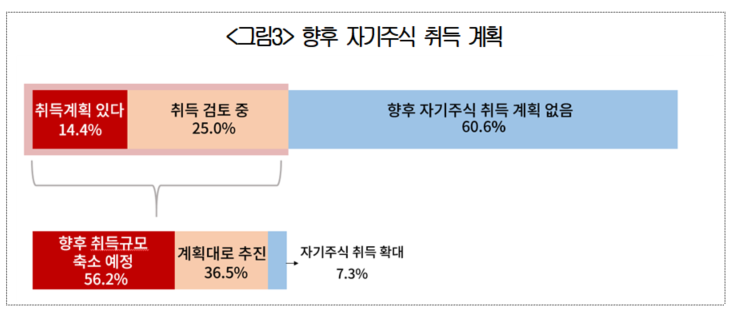 취득계획이 있거나 검토 중인 39.4%의 기업 중에서도 향후 취득규모를 축소하겠다는 기업이 절반을 넘은(56.2%) 반면, ‘계획대로 추진’하겠다는 기업은 36.5%, 오히려 자기주식 취득을 확대하겠다는 기업은 7.3%에 그쳤다.