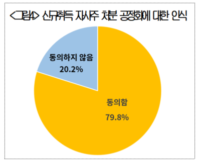 다른 한편으로 응답기업 다수(79.8%)는 자기주식 소각을 의무화하지 않는 대신 ‘신규취득 자기주식에 대한 처분 공정화’에 동의했다. <‘동의하지 않음’ 20.2%> 현재 신주발행 시 신기술도입과 재무구조 개선 등 경영상 필요가 인정되는 경우에만 제3자 배정을 허용하는데, 자기주식 처분도 이에 준해 제3자에 대한 처분을 인정하자는 취지이다.
