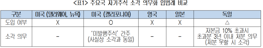 실제로 해외 주요국 가운데 자기주식 보유규제를 두고 있는 나라는 많지 않으며, 독일의 경우 자기자식 보유 비율이 자본금의 10%를 초과할 경우 초과분은 3년 이내 처분해야 하고 기한 내 처분하지 못하면 소각하도록 규정하고 있다.
