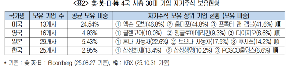 또 美·英·日 시총 상위 30위 기업 중 58개사(64.4%)가 자기주식을 보유하고 있었으며, 평균으로 비교한 경우에도 미국(24.54%), 일본(5.43%), 영국(4.93%)에 비해 우리나라의 보유 비중(2.95%)이 적었다.