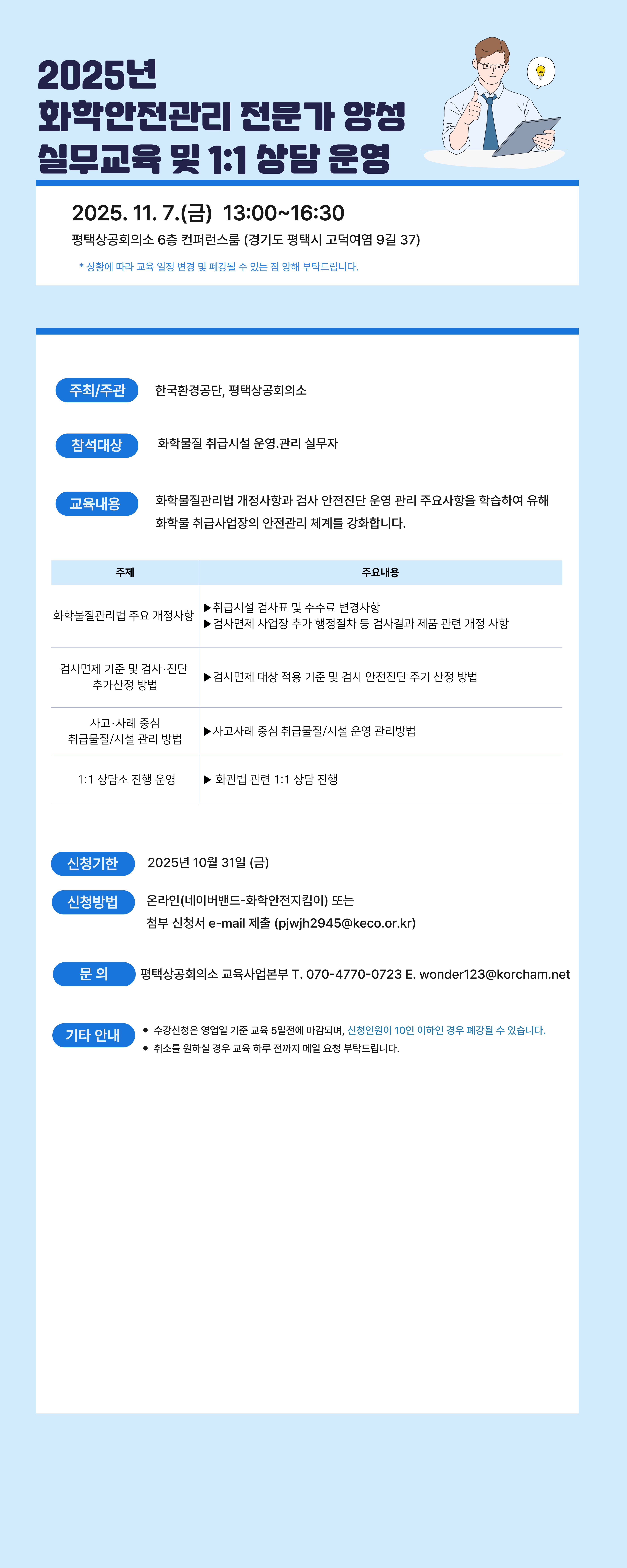 | ‒ | 2025년 화학안전관리 전문가 양성 실무교육 및 1:1 상담 운영 안내 |
