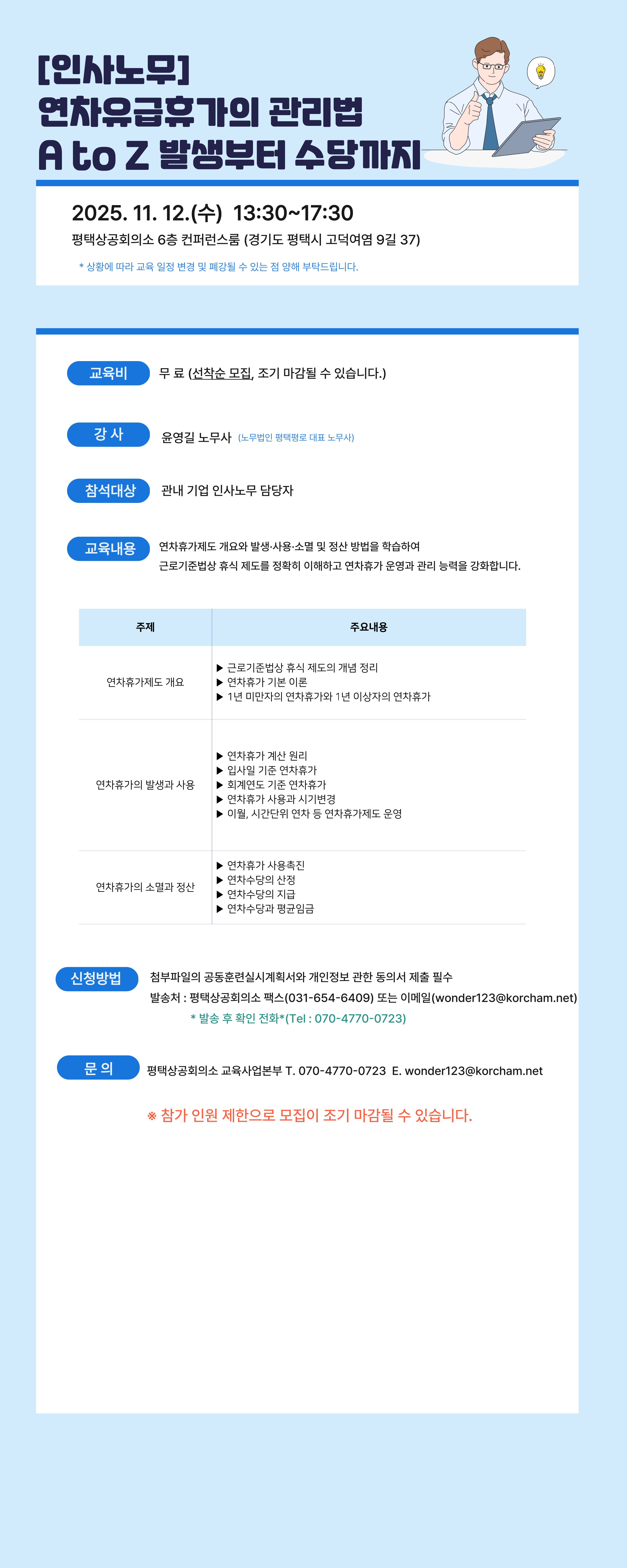 | 제목 | [마감] 연차유급휴가의 관리법 A to Z 발생부터 수당까지 | ||