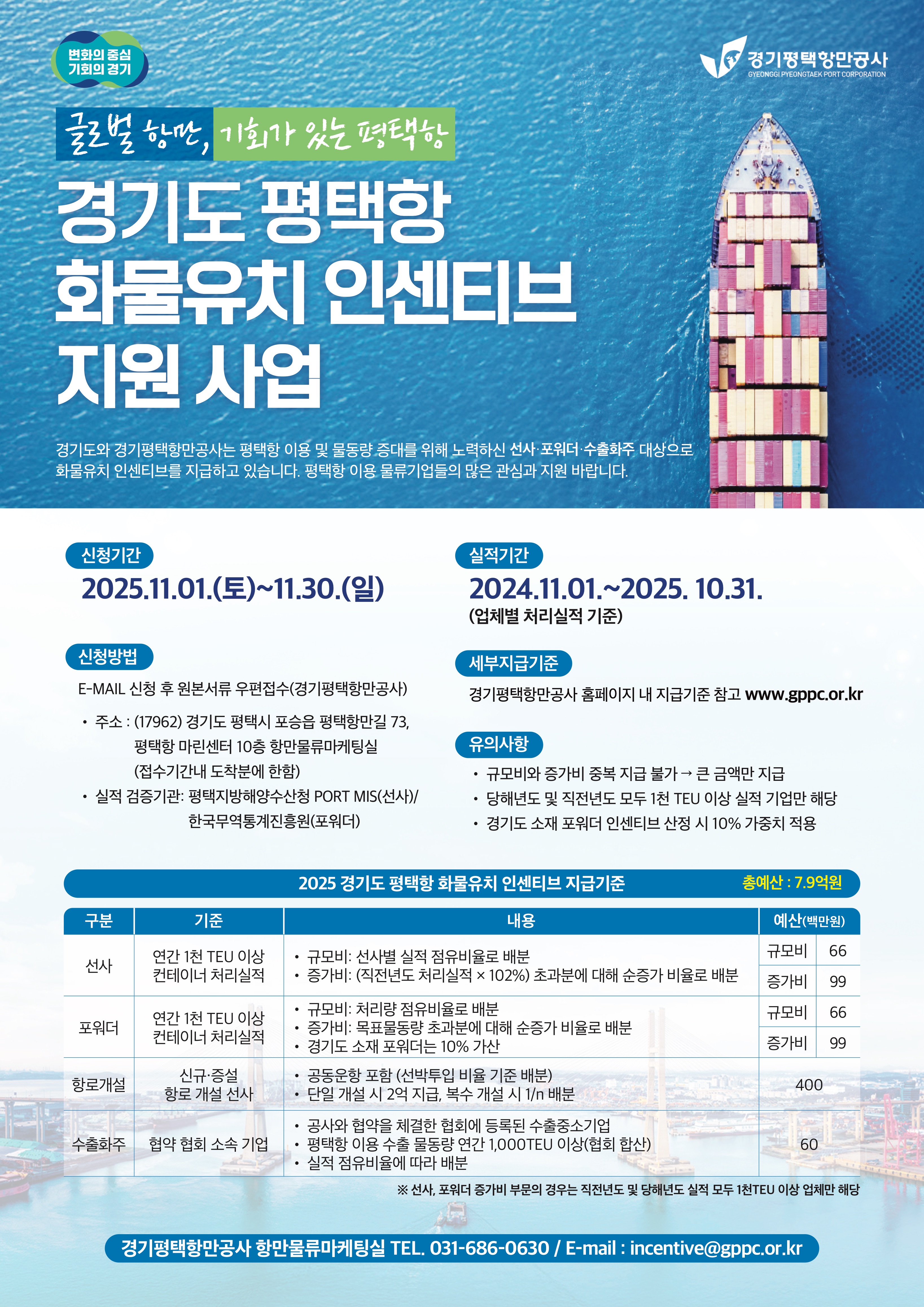 | 제목 | 경기도 평택항 화물유치 인센티브 지원 사업 안내(~11.30) | ||