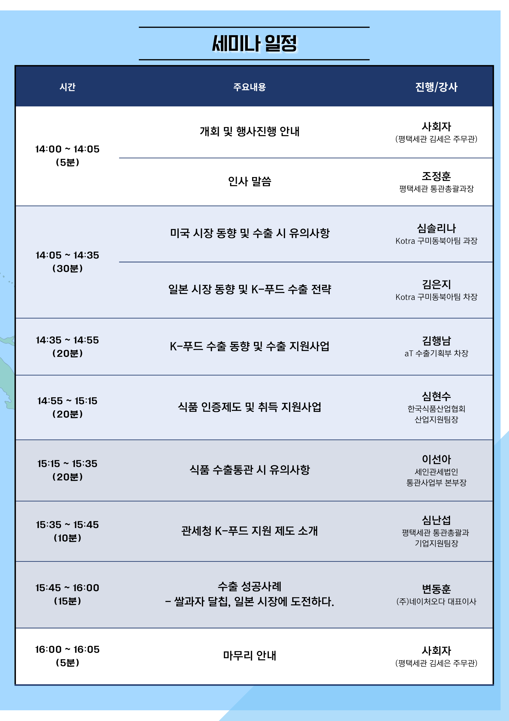 | ‒ | 평택직할세관 중부권 K-푸드기업 수출 전략 웹세미나(4/21) |