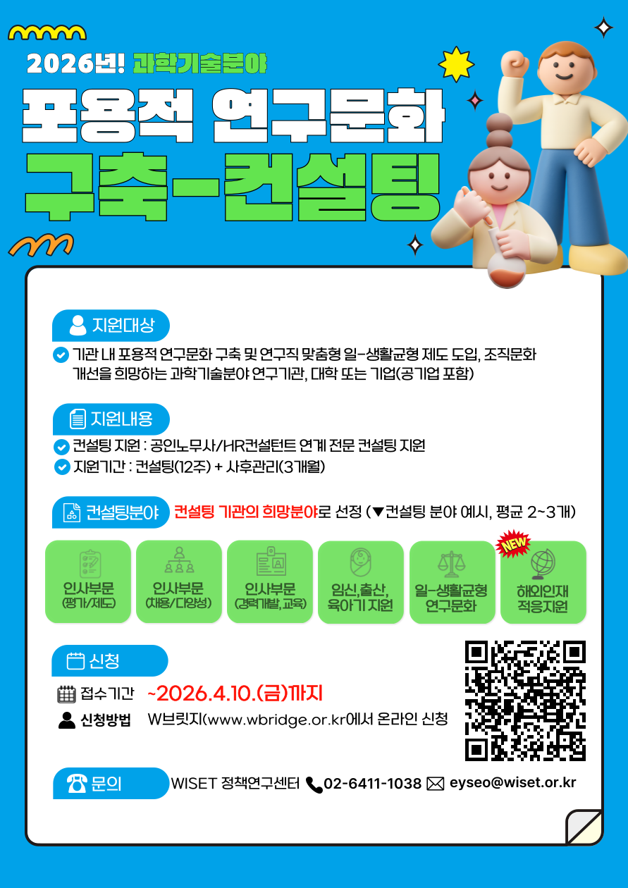 | 제목 | [한국여성과학기술인육성재단] 2026년 포용적 연구문화 구축-컨설팅 참여기관 모집공고 | ||